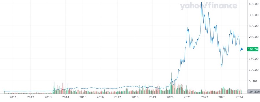 – by 2024 (5 years – assuming $200), your gain would have been 10x